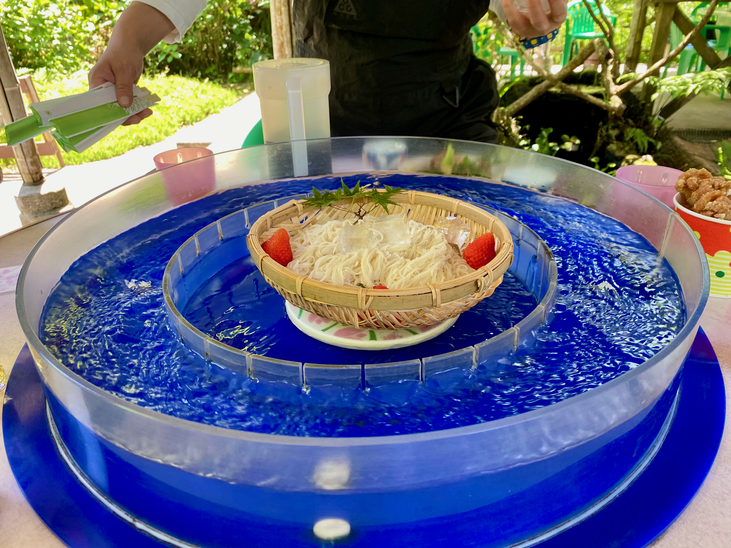 We would end up spending the whole day together. First they drove us to a spot for lunch with a great waterfall view, and noodles that spin around a water shoot that you snatch out with your chopsticks. It even served raw chicken, which we gingerly sampled, and they finished (saving us face by saying, oh, it’s better not to each too much, you might get a stomach ache).
